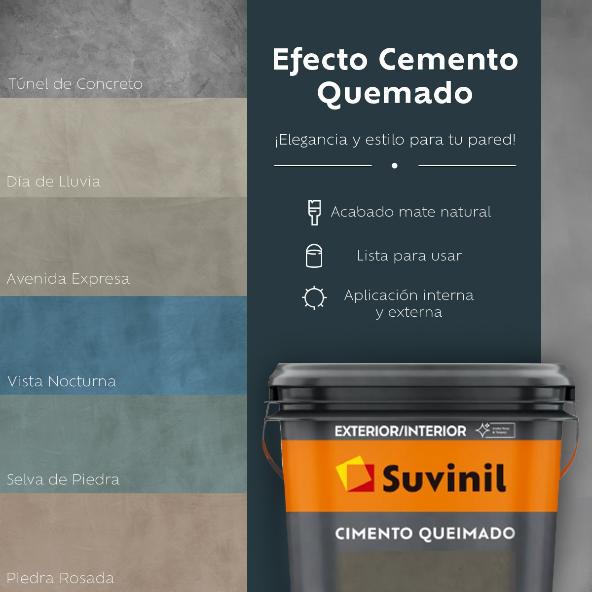 Suvinil Cemento Quemado da a tus paredes la sensación de cemento decorativo, teniendo la versatilidad de tener un acabado mate y satinado, según se requiera, además de eso puede utilizarse tanto en interior como en exterior por su impermeabilidad.